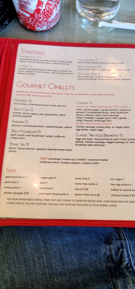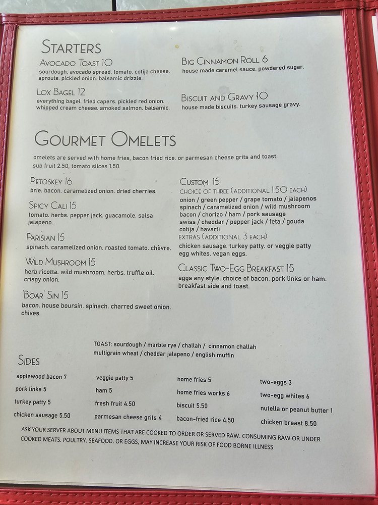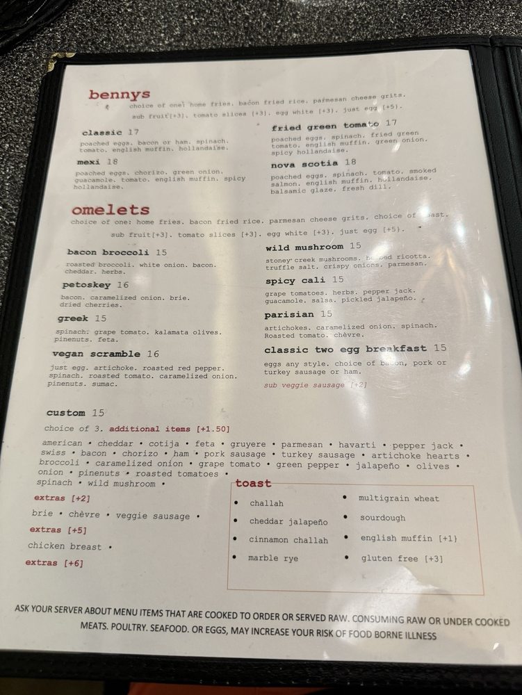 onion / green pepper / grape tomato / jalapenos spinach / caramelized onion / wild mushroom bacon / chorizo / ham / pork sausage swiss / cheddar / pepper jack / feta / gouda cotija / havarti